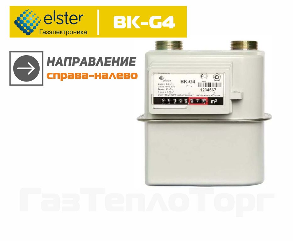 Газовый счетчик BK-G4 (правосторонний) - является бытовым диафрагменным счетчиком газа. Счетчик G4 предназначен для учёта количества потребляемого газа в диапазоне пропускной способности 0,04 – 6 м³/ч. Как правило, счетчик с данной пропускной способностью рекомендуют, если в доме используют газовую плиту и котел отопления.