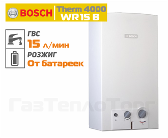 Газовые проточные водонагреватели Bosch серии Therm 4000 0 отличает безопасная и тихая работа, простота в управлении, исключительно высокое качество производимых приборов на заводе Бош в Португалии. Колонки данной серии выпускаются в двух вариантах исполнения: с пьезорозжигом – Терм 4000 O (WR...-P) и автоматическим электророзжигом от батареек – Терм 4000 O (WR...-B). Газовая колонка Бош с широким диапазоном производительности горячей воды в 10, 13 и 15 литров в минуту способна решать любые задачи как для одной, так и для нескольких точек водоразбора одновременно.