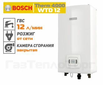 Bosch WTD 12 AM E23 - автоматический газовый водонагреватель, работающий в проточном режиме приготовления горячей воды, производительностью 12 литров воды в минуту при нагреве на 25 °С. Колонкам серии Therm 4000 S требуется подключения к сети 220 Вольт.