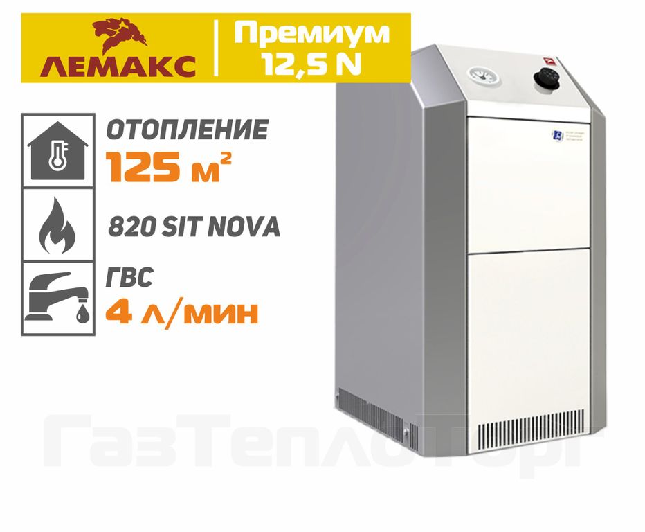Лемакс Премиум 12,5N (В) — газовый котел, с возможностью работы на сжиженном газе, способный отопить жилой дом площадью до 125 м². Премиум 12,5N (В) является двухконтурным, то есть с возможностью приготовления горячей воды. Котел оборудован газовым клапаном 820 Nova Sit, который позволяет подключать комнатный термостат.