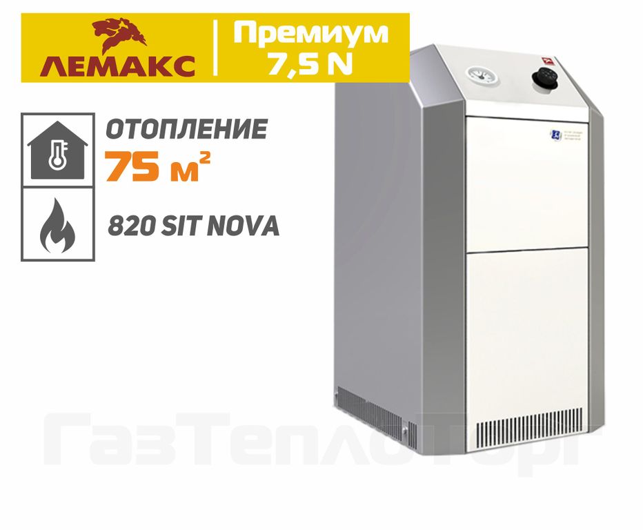 Лемакс Премиум 7,5 N — газовый котел, с возможностью работы на сжиженном газе, способный отопить жилой дом площадью до 75 м². Премиум 7,5 N является одноконтурным, то есть без приготовления горячей воды. Котел оборудован газовым клапаном 820 Nova Sit, который позволяет подключать комнатный термостат.