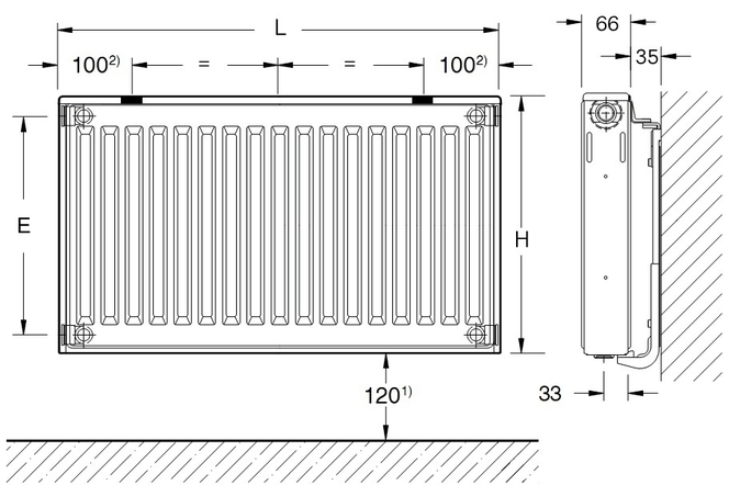 В комплектацию радиаторов Buderus уже входят воздухоотводчик и заглушка, не нужно докупать монтажный комплект. Экологичная окраска и травмобезопасные края делают возможным монтировать радиаторы в лечебных и детских учреждениях. Радиаторы типов 10, 20 и 30 легко содержать в чистоте, чего не скажешь о секционных с их многочисленными ребрами. Поставляется 7 типов (10, 11, 20, 21, 22, 30, 33), 12 длин (400 - 2000 мм) и 5 высот (300 - 900 мм).