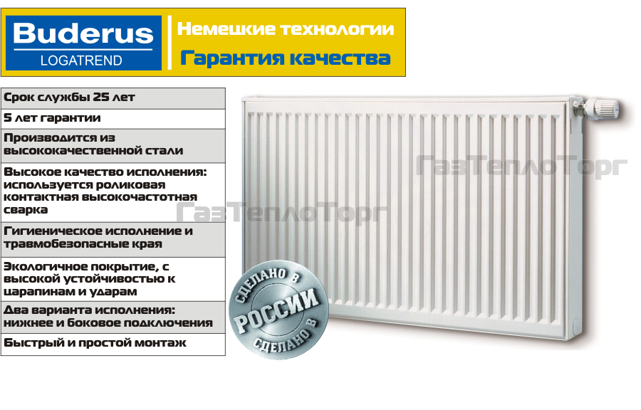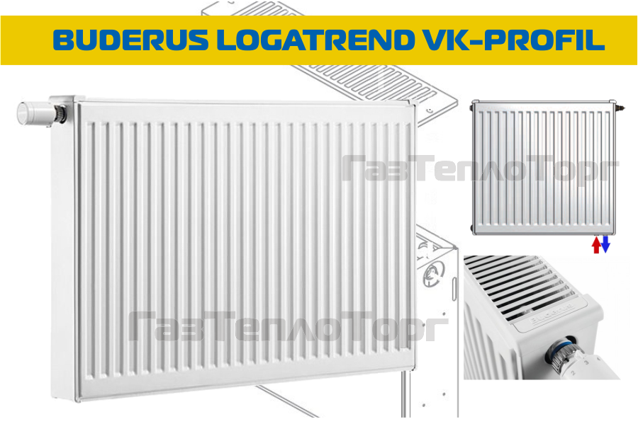 В комплектацию радиаторов Buderus уже входят воздухоотводчик и заглушка, не нужно докупать монтажный комплект. Экологичная окраска и травмобезопасные края делают возможным монтировать радиаторы в лечебных и детских учреждениях. Радиатор в исполнении VK-Profil с нижним подключением экономит до 5% энергии благодаря специальному встроенному термостатическому клапану Danfoss. Поставляется 7 типов (10, 11, 20, 21, 22, 30, 33), 12 длин (400 - 2000 мм) и 5 высот (300 - 900 мм).
