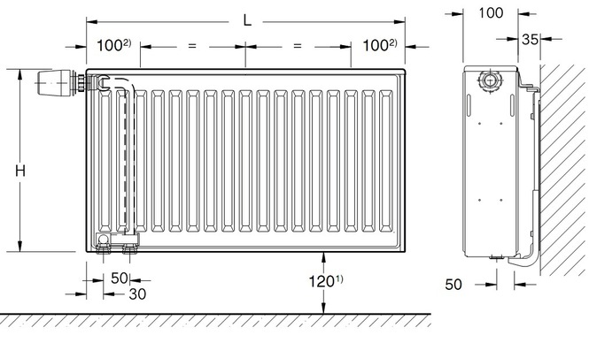 В комплектацию радиаторов Buderus уже входят воздухоотводчик и заглушка, не нужно докупать монтажный комплект. Экологичная окраска и травмобезопасные края делают возможным монтировать радиаторы в лечебных и детских учреждениях. Радиатор в исполнении VK-Profil с нижним подключением экономит до 5% энергии благодаря специальному встроенному термостатическому клапану Danfoss. Поставляется 7 типов (10, 11, 20, 21, 22, 30, 33), 12 длин (400 - 2000 мм) и 5 высот (300 - 900 мм).