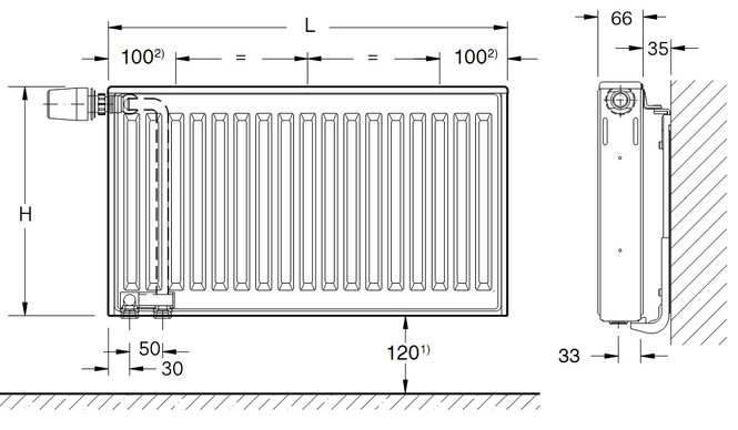 В комплектацию радиаторов Buderus уже входят воздухоотводчик и заглушка, не нужно докупать монтажный комплект. Экологичная окраска и травмобезопасные края делают возможным монтировать радиаторы в лечебных и детских учреждениях. Радиатор в исполнении VK-Profil с нижним подключением экономит до 5% энергии благодаря специальному встроенному термостатическому клапану Danfoss. Поставляется 7 типов (10, 11, 20, 21, 22, 30, 33), 12 длин (400 - 2000 мм) и 5 высот (300 - 900 мм).