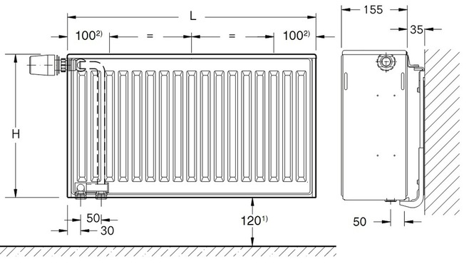 В комплектацию радиаторов Buderus уже входят воздухоотводчик и заглушка, не нужно докупать монтажный комплект. Экологичная окраска и травмобезопасные края делают возможным монтировать радиаторы в лечебных и детских учреждениях. Радиатор в исполнении VK-Profil с нижним подключением экономит до 5% энергии благодаря специальному встроенному термостатическому клапану Danfoss. Поставляется 7 типов (10, 11, 20, 21, 22, 30, 33), 12 длин (400 - 2000 мм) и 5 высот (300 - 900 мм).
