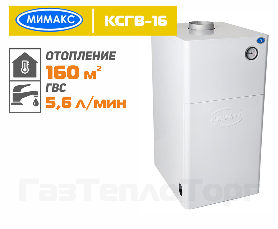 Мимакс КСГВ-16 — напольный газовый котел для отопления жилых домов площадью до 160 м², для которого предусмотрен стационарный дымоход. Данная модель является двухконтурной с возможностью получения горячей воды в бытовых нуждах.