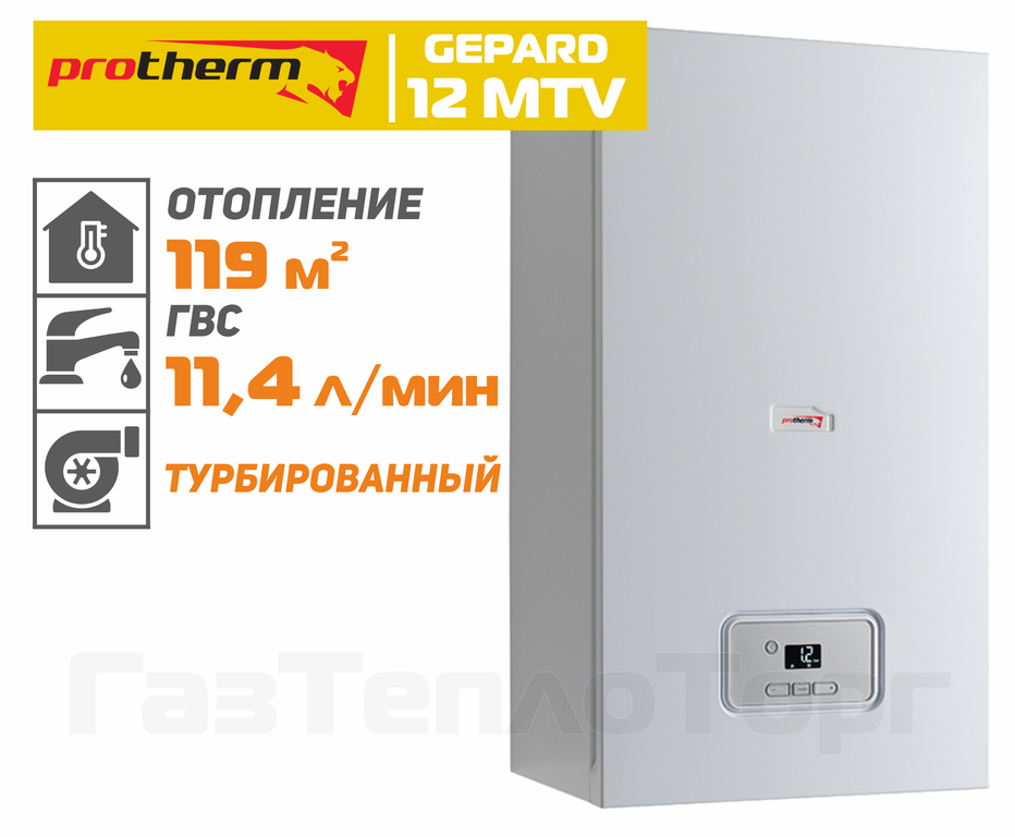 Protherm GEPARD 12 MTV — турбированный котел (закрытая камера сгорания) с отводом дымовых газов с помощью вентилятора через коаксиальную трубу 60/100 или разделитель 80/80. Двухконтурный котел Протерм Гепард 12 способен отопить жилой дом площадью до 119 м². Пластинчатый теплообменник обеспечивает непрерывную подачу горячей воды, производительностью 11,4 литров в минуту.