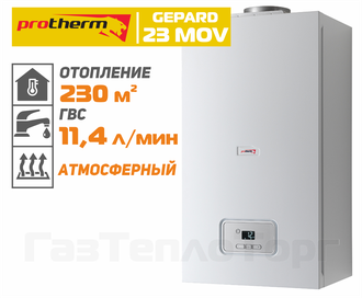 Protherm GEPARD 23 MOV — атмосферный котел (открытая камера сгорания) с естественным отводом дымовых газов с помощью стационарного дымохода и забором воздуха из помещения. Двухконтурный котел Протерм Гепард 23 mov способен отопить жилой дом площадью до 230 м². Пластинчатый теплообменник обеспечивает непрерывную подачу горячей воды, производительностью 11,4 литров в минуту.