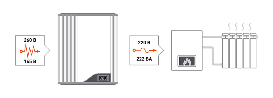Teplocom ST-222/500-И, общей мощностью 200 ВА, может использоваться в качестве стабилизатора напряжения для настенных турбированных (закрытая камера сгорания) и атмосферных (открытая камера) котлов с активной потребляемой мощностью до 140 Вт.