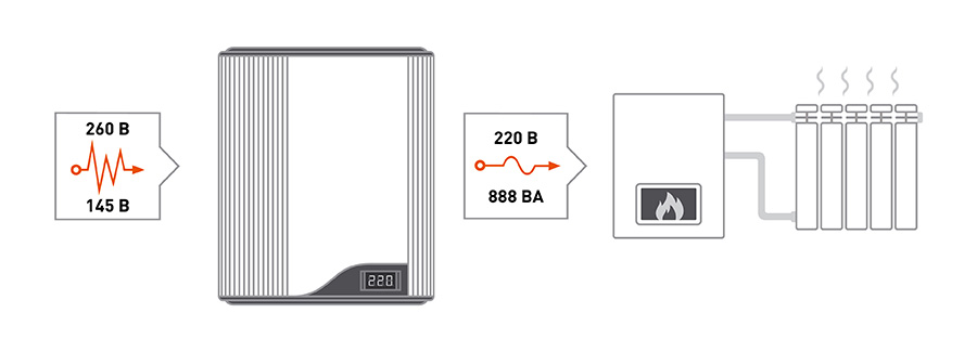 Teplocom ST-888-И, общей мощностью 600 ВА, может использоваться в качестве стабилизатора напряжения для настенных турбированных (закрытая камера сгорания) и атмосферных (открытая камера) котлов с активной потребляемой мощностью до 420 Вт.