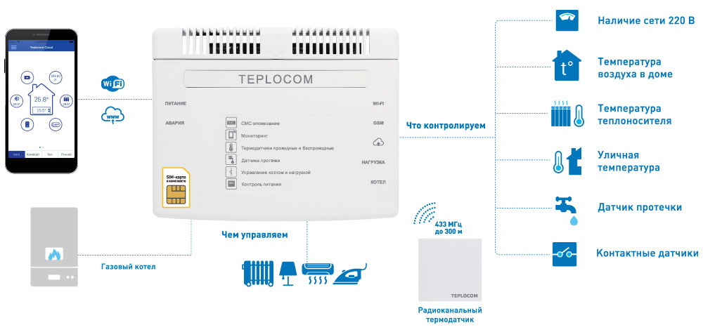 TEPLOCOM CLOUD предназначен для информирования о состоянии системы отопления и предупреждении об аварийных ситуациях, а также дистанционного контроля и управления отопительным котлом через облачный сервис и мобильное приложение. Контроль сети 220 В, контроль температуры (до 10 датчиков), контроль контактных датчиков (3 входа), контроль состояния котла, управление котлом (релейное или OpenTherm). Выход для управления котлом, выход для управления нагрузкой, выход для подключения модуля OpenTherm, 3 входа для внешних контактных датчиков, встроенный Wi-Fi модуль, GSM модуль, радиомодуль. В комплекте: 2 проводных термодатчика, радиотермодатчик, датчик протечки, встроенный аккумулятор, сетевой адаптер, СИМ-карта. ПО на Android и iOS.