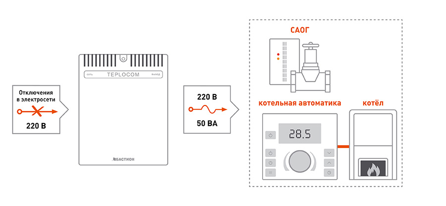 Источник бесперебойного питания для котельной автоматики TEPLOCOM-50+. 220 В, 50 ВА, Online. Автоматический переход на резервное питание от АКБ при пропадании сети. Пластиковый корпус рассчитан под установку АКБ 7 Ач. Возможность подключения внешней АКБ до 26 Ач. Защита АКБ от глубокого разряда, оптимальный заряд АКБ, защита от перегрузки, индикация режимов работы, настенная установка. Разработан с учётом специфики работы котельной автоматики.