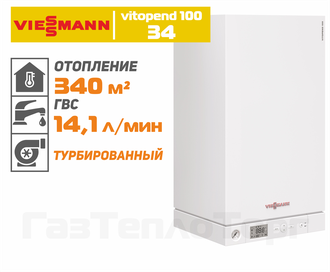 Viessmann Vitopend 100-W A1JB 34 кВт - двухконтурный (A1JB) турбированный котел, способный отопить жилой дом площадью до 340 м² и снабнить горячей технической водой 14,1 л/мин.